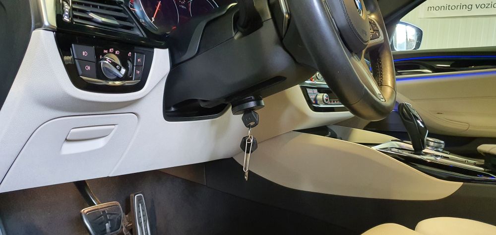 Mechanické zabezpečení BMW 5. Do vozu byl instalován zámek volantu Zeder. Unikátní systém blokující volantovou tyč proti neoprávněnému pohybu. Bližší info na https://www.carsecurity.cz/zeder-lock/
