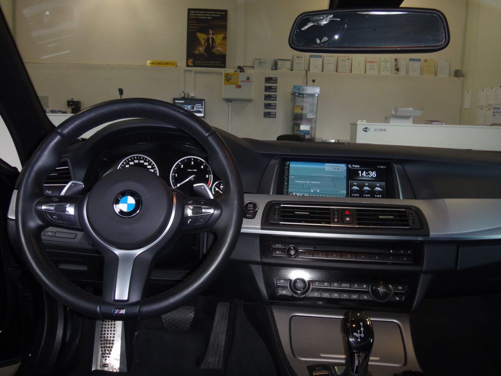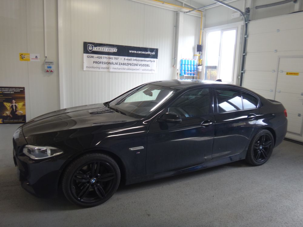 BMW 5 montáž autoalarmu Jablotron CA-2103. Autoalarm střeží dveřní vstupy, kapotu, kufr, je vybaven otřesovým čidlem, záložním zdrojem a imobilizačním okruhem. Má přímé připojení na datovou sběrnici a umožňuje ovládání originálním klíčem vozu nebo přes keyless.