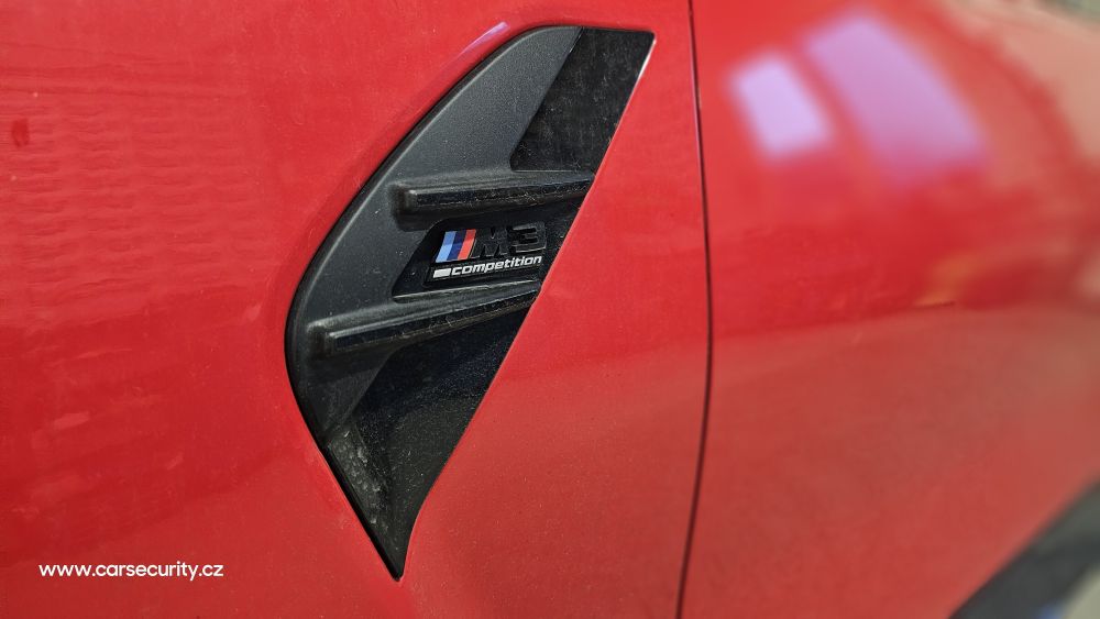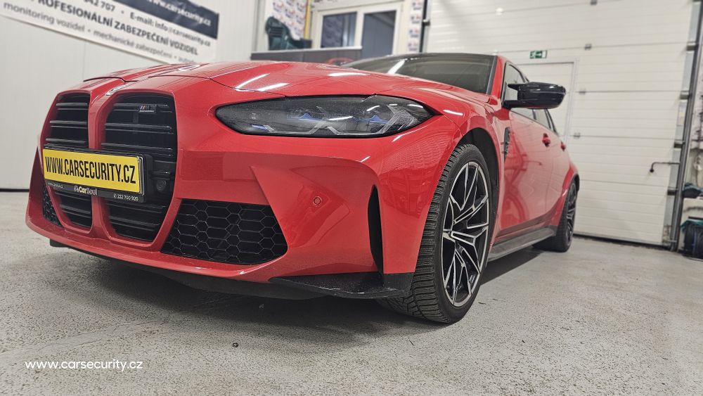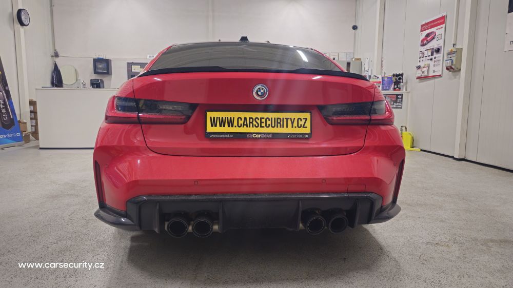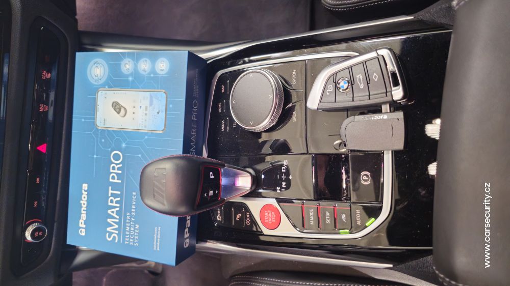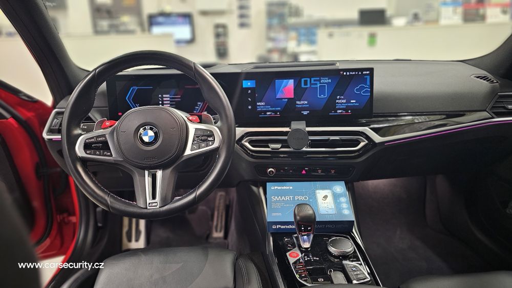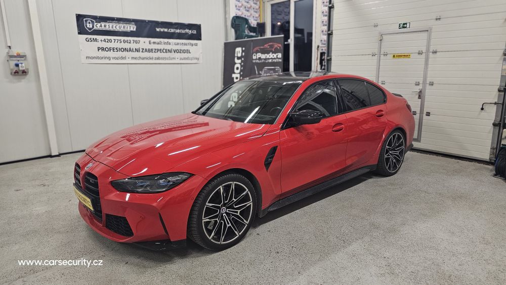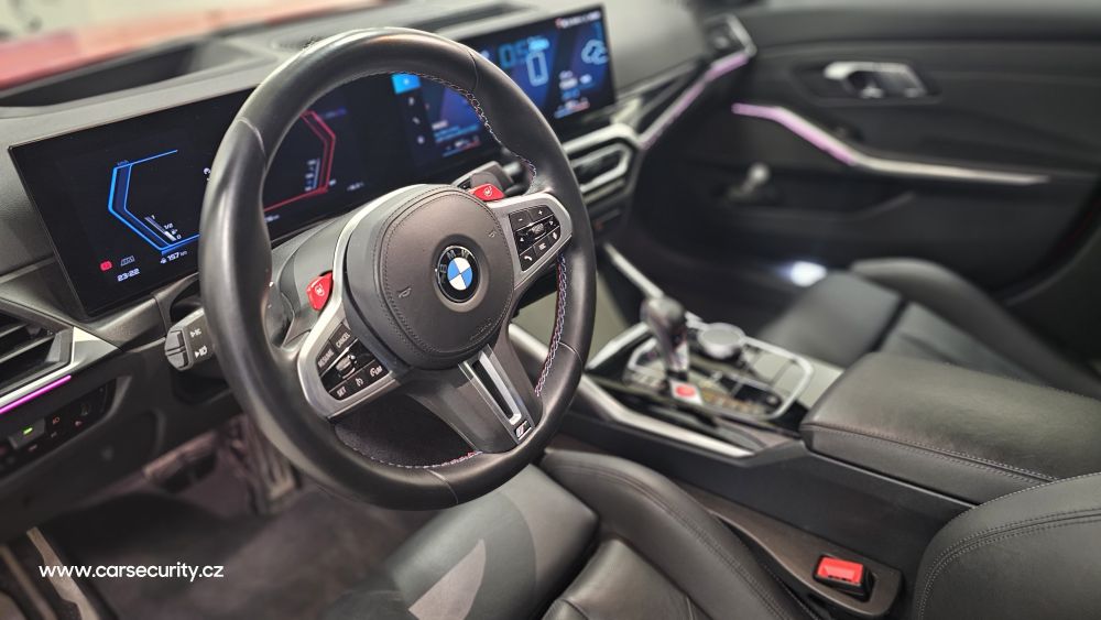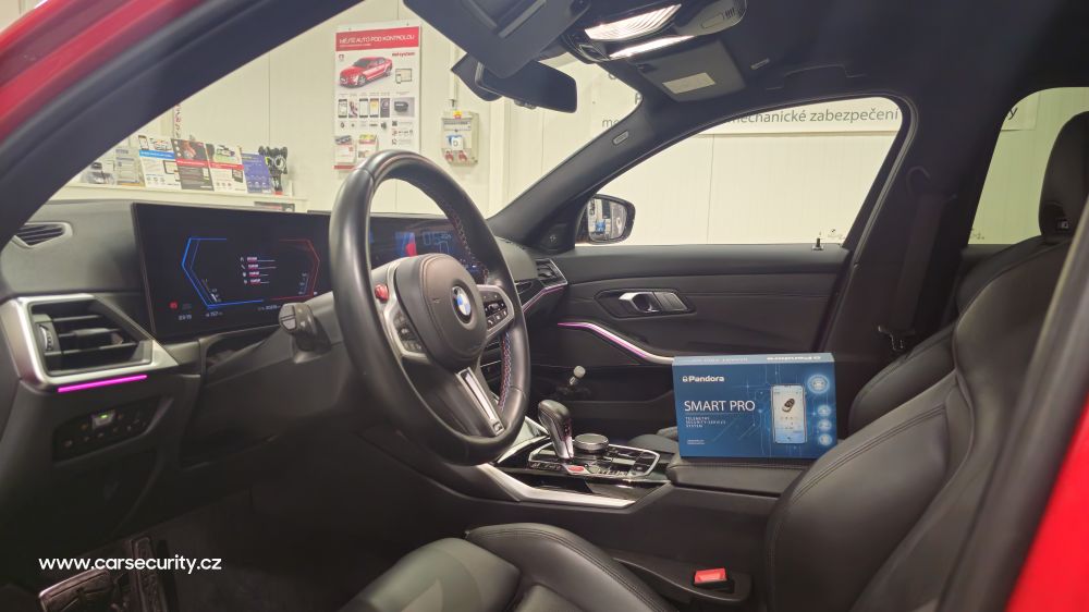 BMW M3 G80/G20 montáž dálkového startu motoru systémem Pandora SMART PRO v4. Autoalarm detekuje otevření dveří, kapoty a kufru, blokuje neoprávněný start motoru a hlída posun, náraz a náklon vozu.