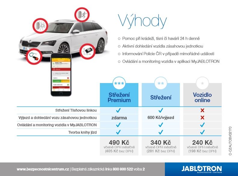 Autoalarm Jablotron CA-2103 je nástupcem skvělého alarmu Jablotron Athos CA-1803. Je doplněn mnoha novými funkcemi, které jistě oceníte. Základní funkce autoalarmu zůstaly, jako je střežení dveřních vstupů, kapoty, kufru nebo imobilizace vozu a zjištění polohy. Autoalarm je možné nadále ovládat originálním klíčem vozu nebo externí klíčenkou, ale je také možné toto ovládání kombinovat. Dále je také možné alarm ovládat aplikací MyJABLOTRON. Autoalarm je vybaven 2G GSM modulem a při vyvolání poplachu volá na přednastavená telefonní čísla kam následně posílá SMS zprávu s druhem události a notifikaci do apliakce. Autoalarm je také možné připojit na PCO, kde se o vaše vozidlo stará bezpečnostní agentura 24/7. Připojení na pult umožňuje vedení knihy jízd, s rozdělováním na soukromou a služební jízdu.