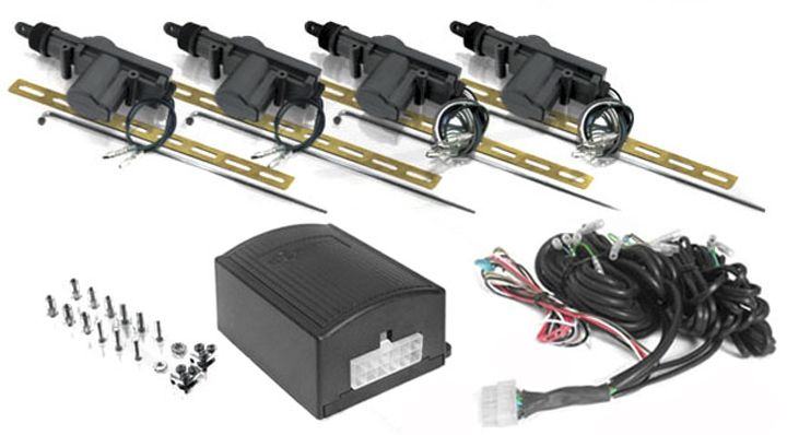 KEETEC centrální zamykání na klíč pro 4-dveře, 2 ks pětivodičové servo, 2 ks dvojvodičové servo, řídící jednotka, kabeláž, plechy, táhla