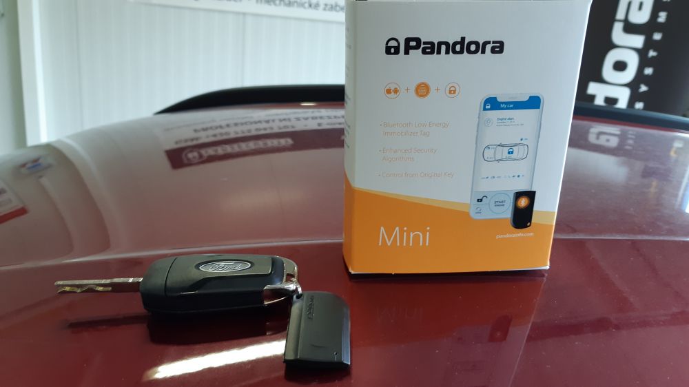 Zabezpečeno autoalarmem Pandora MINI s bezkontaktní blokací motoru. Autoalarm s BT aplikací.