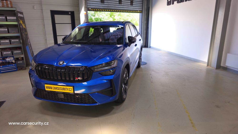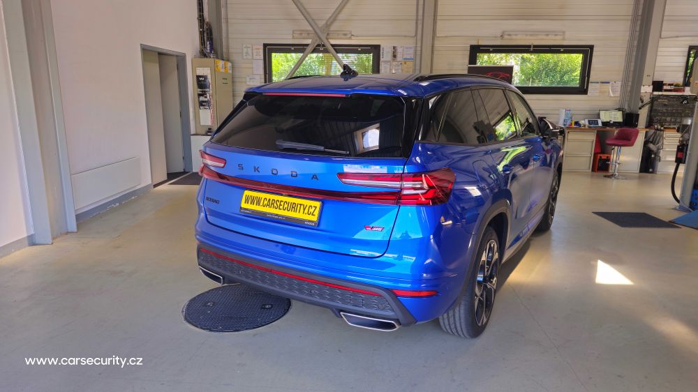 Zabezpečení nového vozu Škoda Kodiaq RS II. Autoalarm střeží otevření dveří, kapoty a kufru. Je vybaven 3D akceleračním senzorem, který střeží posun, náraz nebo náklon vozu. V případě vyvolání poplachu je spuštěna siréna a začnou blikat blinkry. Systém je dále vybaven blokací motoru proti neoprávněnému startu. Autorizace oprávněného uživatele je pomocí bezkontaktních tagů nebo autorizovaného mobilního telefonu.