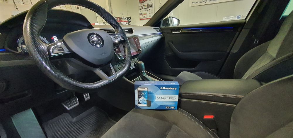 Škoda Superb III montáž GSM/GPS autolalarmu Pandora SMART PRO v3 s dálkovým startem motoru.